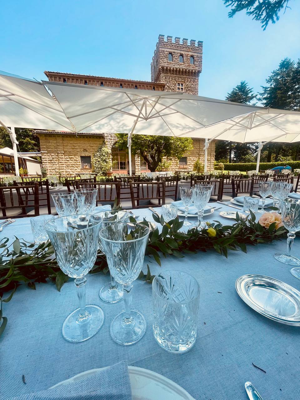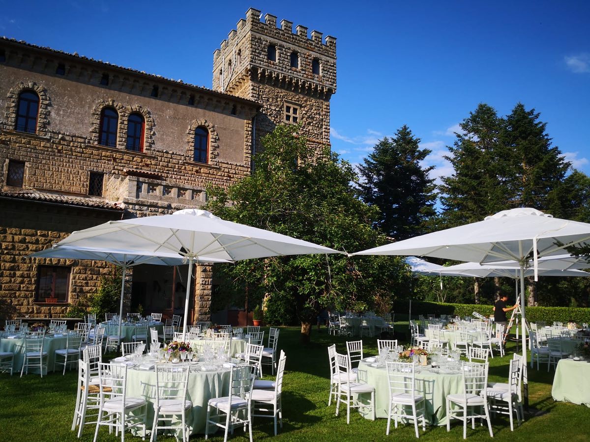 Potrai scegliere tra diverse aree della proprietà, dal bosco privato ai giardini panoramici, dalla terrazza a bordo piscina agli eleganti spazi interni. Per chi desidera fermarsi a dormire, sono disponibili 23 camere tra il borgo e il castello, inclusa una romantica suite per gli sposi.