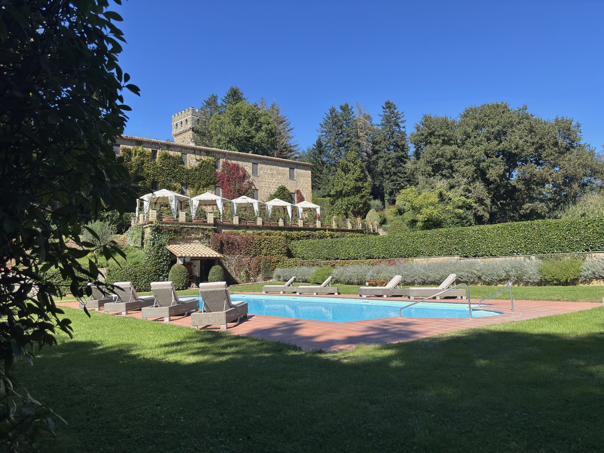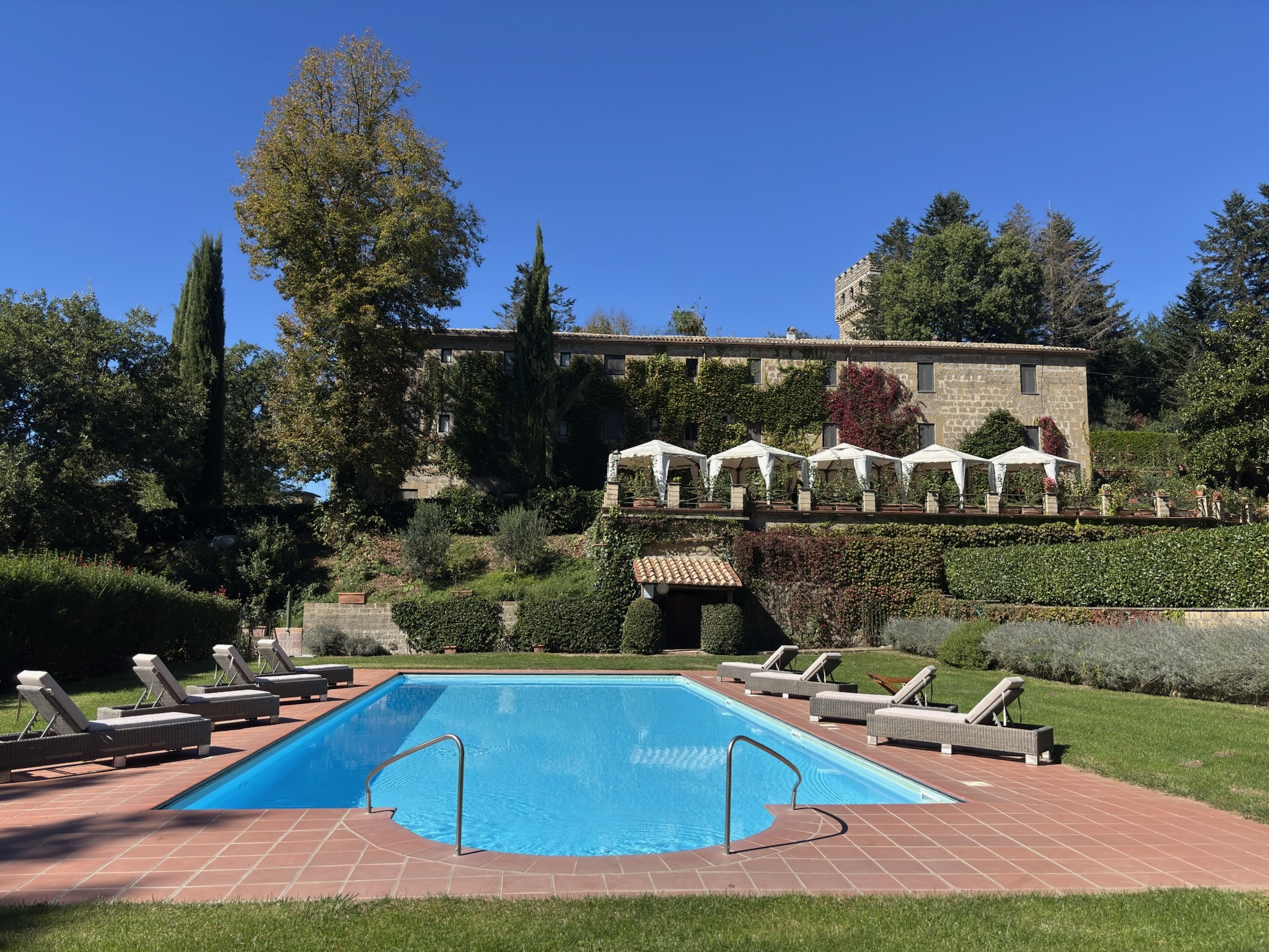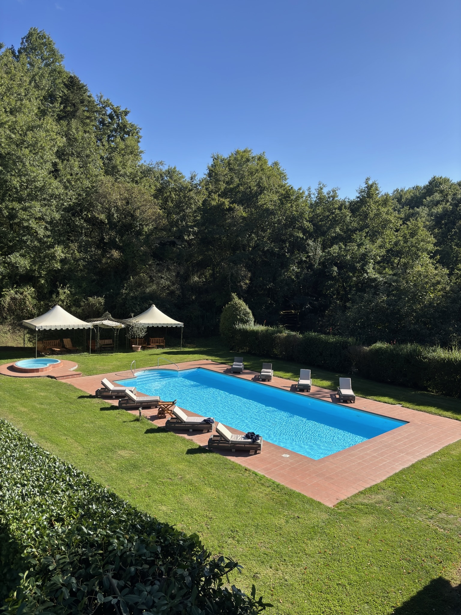 La tenuta dispone di una grande piscina panoramica circondata da lettini, perfetta per rilassarsi al sole nelle giornate estive. Accanto si trova una piscina più piccola dedicata ai bambini.